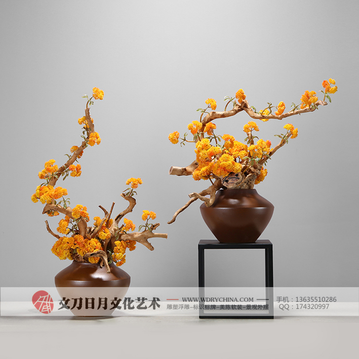 新中式仿真盆景花艺橙色软装空间项目桌...